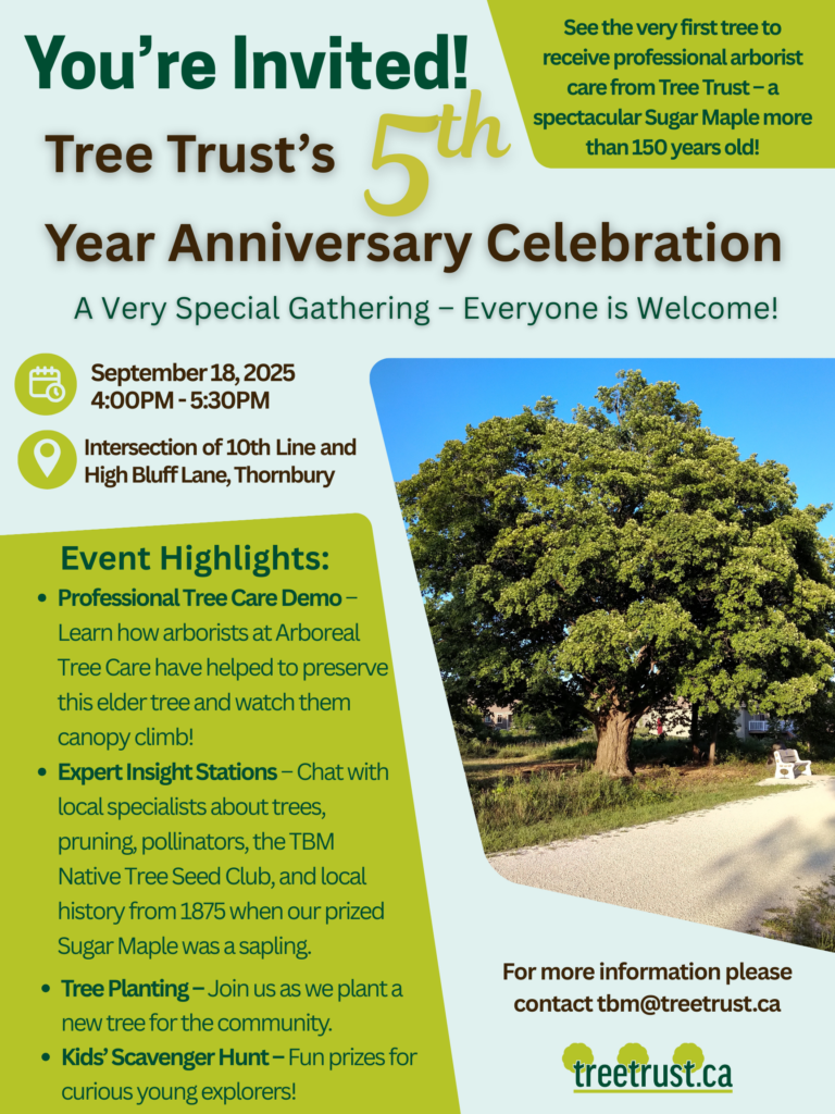 Join us in celebrating the Town of Blue Mountains Tree Trust 5th Anniversary! Come out on September 18 at 4:00 PM and enjoy a family-friendly afternoon with a live demonstration of expert tree care, tree planting, information stations led by local experts, and a scavenger hunt with prizes for kids. We look forward to seeing you there!