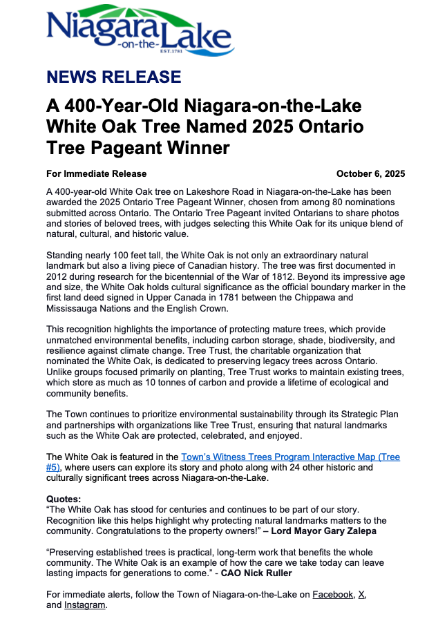 On October 4th, 2025 the winning White Oak was honoured in a special celebration in Niagara-on-the-Lake. It made for a very special morning that was complemented with live music, council representation, and words from the Epp family, who have championed and defended this tree over many years.