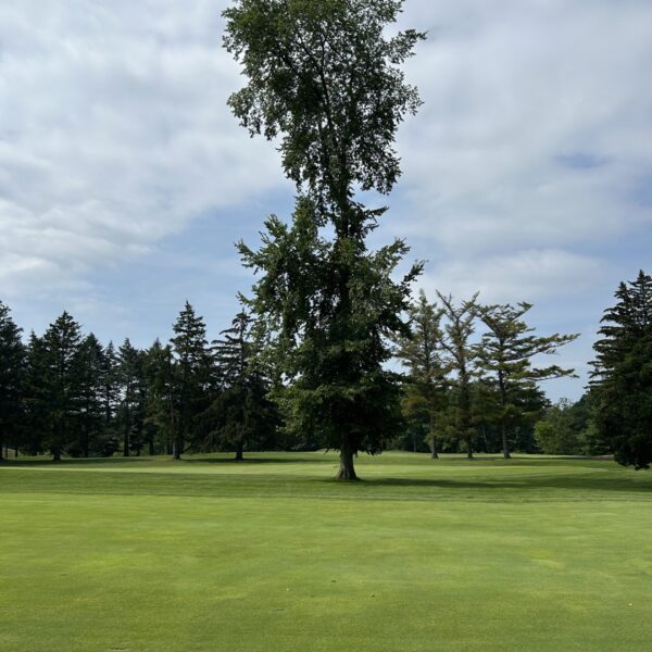 - Back in 2017-2018 between holes 11&12 we began to clear a grove of three 50+ year old declining silver maples along with two unhealty spruce and a couple of red pine to open up air and light for the turf underneath. As the removals progressed we discovered deep inside the grove quite a tall, spindly, sparsley crowned looking elm that seemed to be doing rather well in that enviornment all things considered. We decided that since it was giving it's all to thrive in those clustered surroundings we owed our Charlie Brown elm a shot at making the big time. The thin crown of 8 years ago is now thick and shapely and what was once a bare trunk is now covered in lower branching that once thriving elm displayed back before the dutch elm eradicated the species in this area. Our Charlie Brown elm has survuved numerous wind storms these past few years and has become a beacon and focal point alongside the buckeye we planted after the removals. We feel that its determination and grit deserves our nomination for the Ontario Tree Pagent.