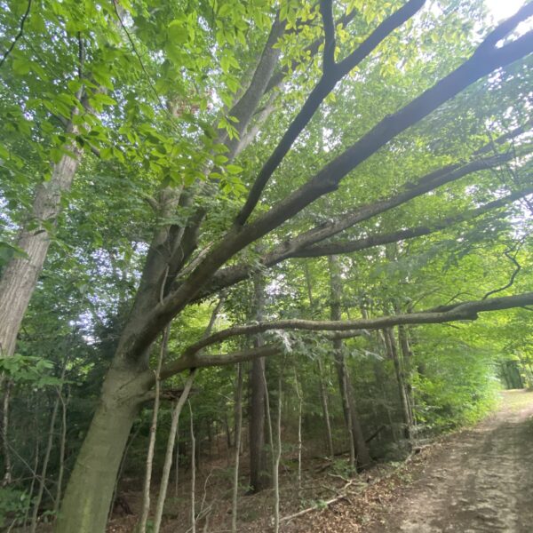 Sadly, this great White Pine tree which is older than the Municipality, is slated to be cut down in the name of progress. If the Municipal Council has its way the tree will be removed to make way for condos. - Our massive one-sided beech tree at has impressively adapted, reaching for the sun and defying gravity. We love it as a feature in our mixed-zone woodlot hike! the beech tree appears to be free of disease and is still going strong amidst all the shade and lopsided-ness. It also marks the environmentally protected wetland area of the property. It’s a very quirky feature of our walk that everyone loves to point out. The huge arms reaching toward the field are really incredible and I always imagine what it would be like to be a little chipmunk getting to explore it all the way to the top.