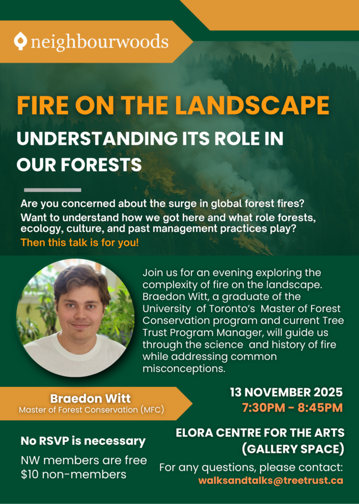 Join us for an evening exploring the complexity of fire on the landscape. Braedon Witt, a graduate of the University of Toronto’s Master of Forest Conservation program and current Tree Trust Program Manager, will guide us through the science and history of fire while addressing common misconceptions.