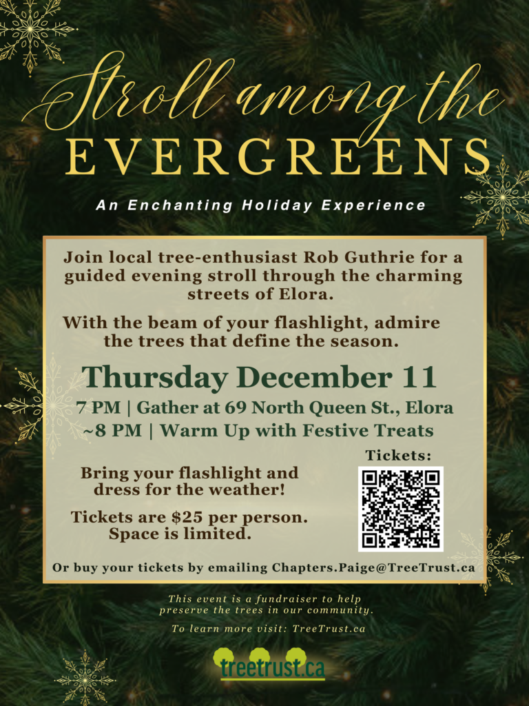 Join local tree-enthusiast Rob Guthrie for a guided evening stroll through the charming streets of Elora. With the beam of your flashlight, admire the trees that define the season.